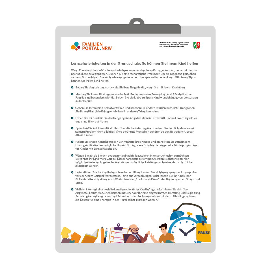 Федералната асоциация за дислексия и дискалкулия e.V. NRW предлага на родителите в Северен Рейн-Вестфалия широк спектър от помощ и подкрепа с актуална информация и проучвания, както и индивидуални консултации и събития. На портала на Федералната асоциация за дислексия и дискалкулия (Bundesverband Legasthenie und Dyskalkulie e.V.) можете да намерите търсенеза квалифицирани терапевти във вашия район