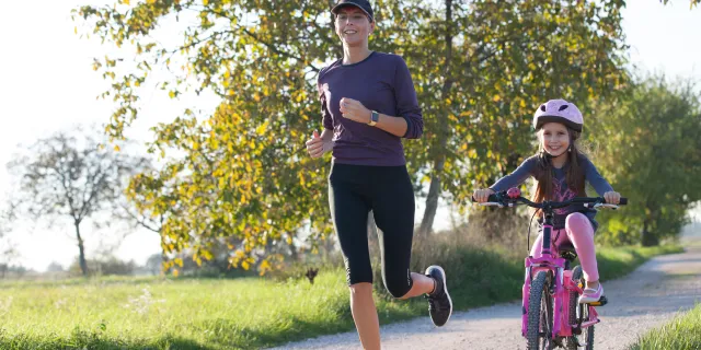 Umso wichtiger ist es, achtsam mit sich umzugehen und täglich etwas für die eigene Fitness und das Wohlgefühl zu tun. Manchmal reicht es schon, kleine Gewohnheiten zu ändern, um gesünder zu leben. Laufen Sie zum Beispiel zum Bäcker, anstatt mit dem Auto zu fahren. Oft dauert es gar nicht viel länger. Oder nehmen Sie sich abends, nachdem Sie Ihr Kind ins Bett gebracht haben, ein bisschen Zeit für eine entspannende Yoga-Einheit oder ein auspowerndes Krafttraining. Wussten Sie, dass aktive Eltern auch aktive Kinder haben? Ihr Nachwuchs lernt Bewegung als etwas Selbstverständliches kennen und wird selbst aktiver, wenn Sie ein gutes Vorbild sind.