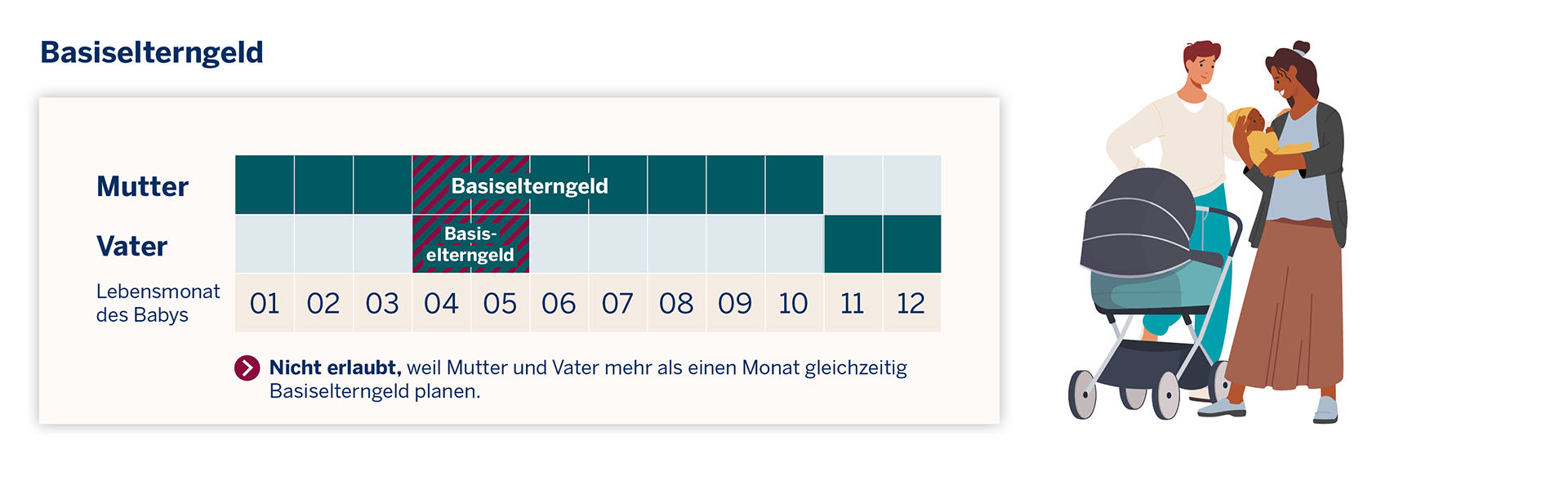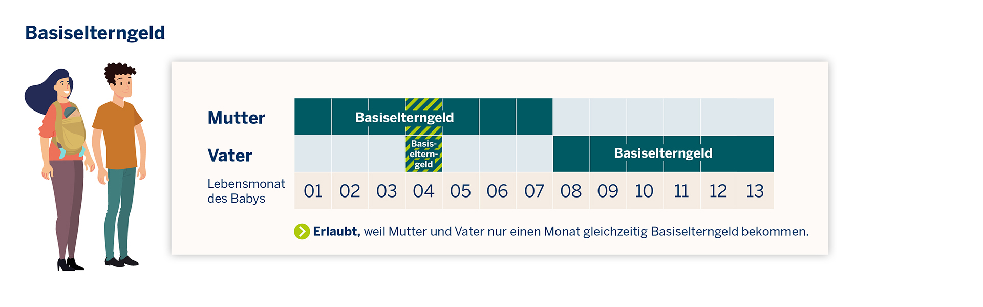 - Die Mutter nimmt im 4. und 13. Lebensmonat Basiselterngeld, der Vater nimmt im 13. und 14. Lebensmonat Basiselterngeld -> nicht zulässig, weil nach dem 12. Lebensmonat Basiselterngeld nicht mehr gemeinsam bezogen werden kann.