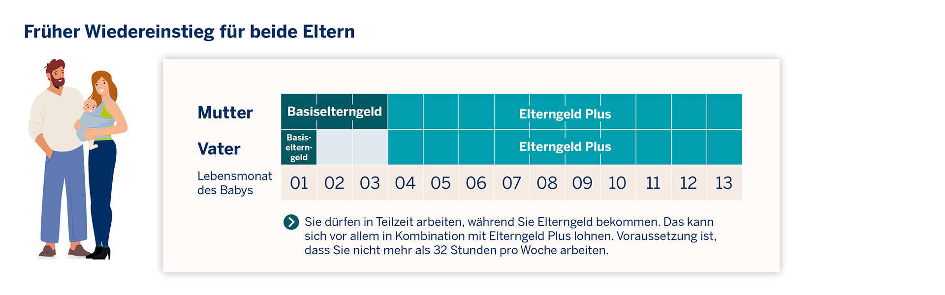Beispiel: Die Mutter beantragt Elterngeld für die Monate 1-7, der Vater für die Monate 8-14.Sie können in Teilzeit arbeiten, während Sie Basiselterngeld erhalten. Aber höchstens 32 Stunden pro Woche.