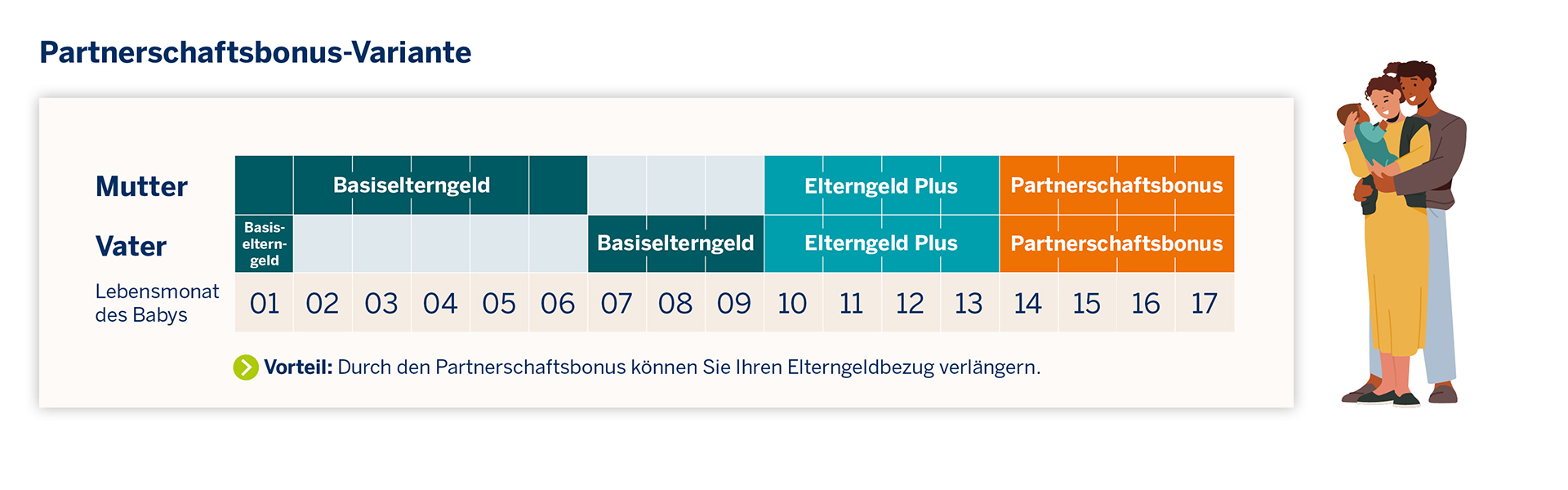 Den Partnerschaftsbonus können Eltern für mindestens zwei und maximal vier Monate beantragen. Alleinerziehende bekommen den vollen Partnerschaftsbonus.