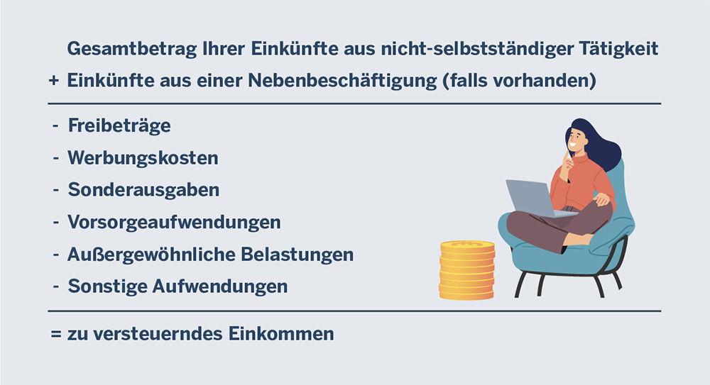 Um Ihr zu versteuerndes Jahreseinkommen zu ermitteln, können Sie von Ihrem Bruttogehalt folgende Beträge abziehen: