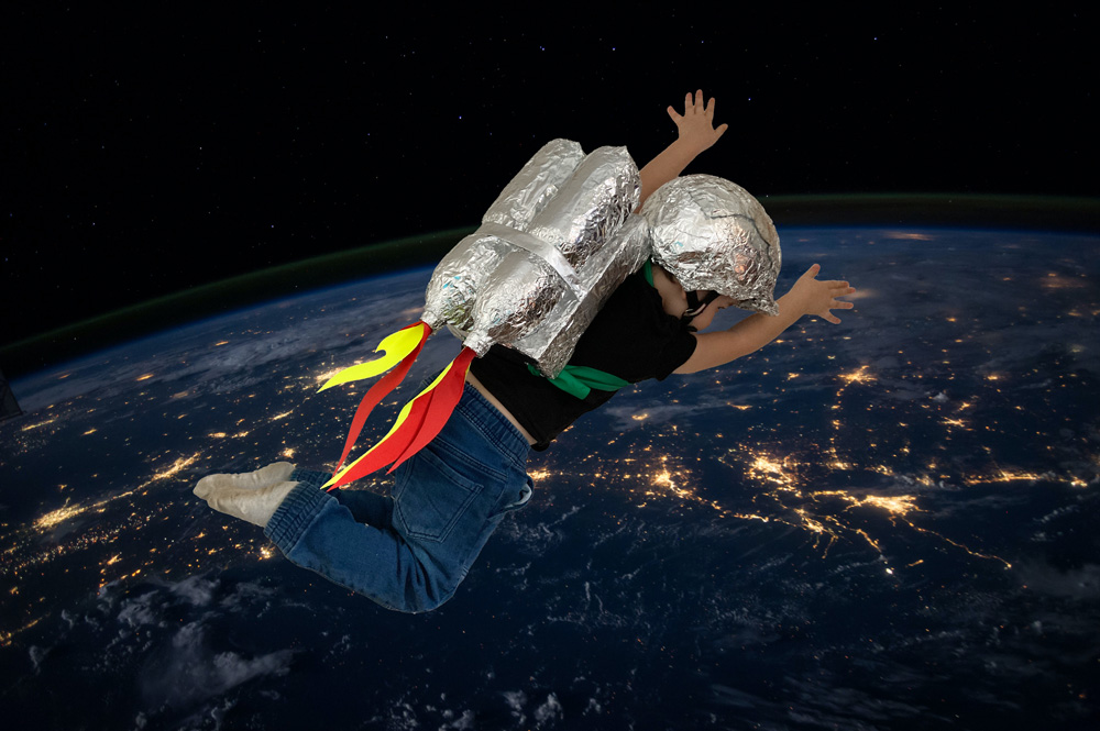 Aus den Kartonresten zwei große Flügel ausschneiden und mit Klebeband an der Oberkante des Kartons befestigen. Die Flügel können ebenfalls bunt angemalt werden.