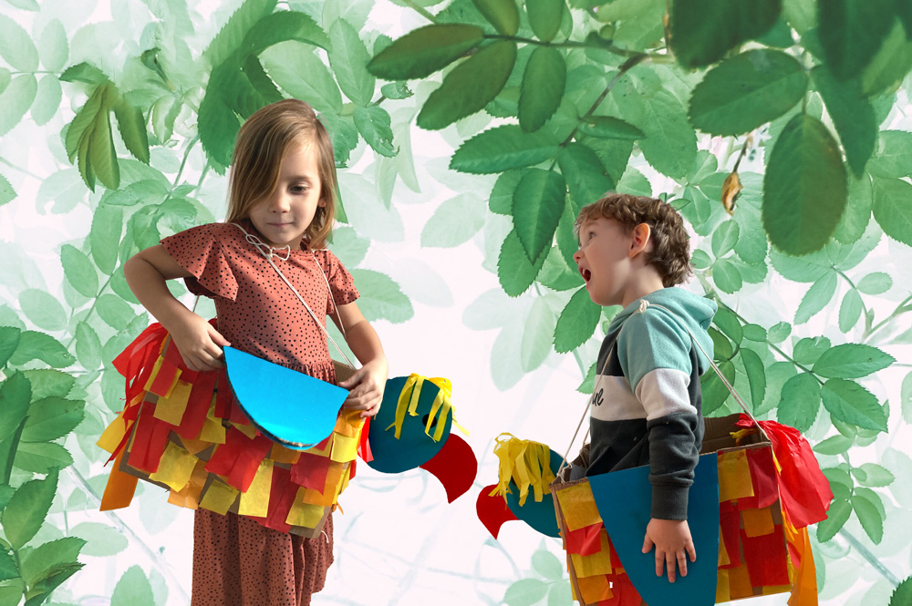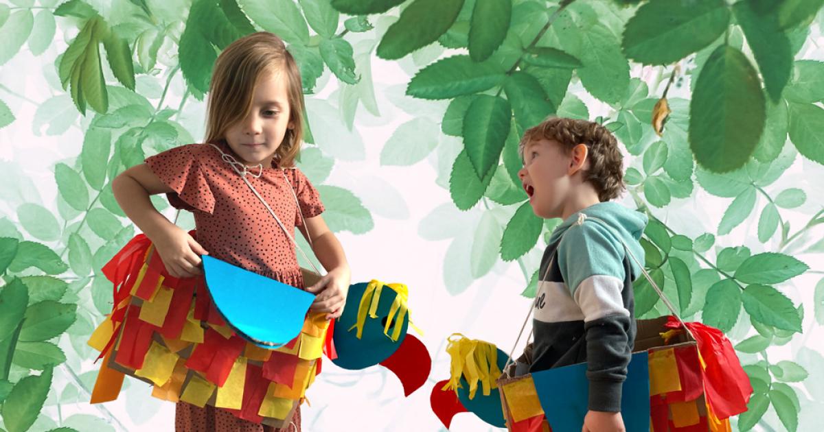 In den Karton auf der Vorder- und Rückseite je 2 Löcher stechen und die Kordel daran befestigen, damit Ihr Kind den Paradiesvogel auf den Schultern tragen kann. Die Länge passen Sie der Größe Ihres Kindes an.