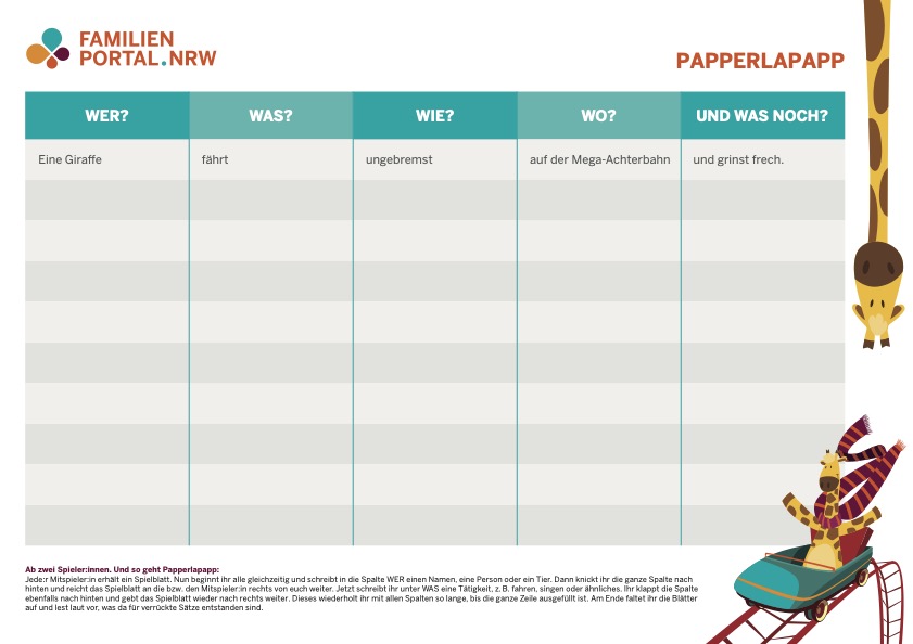 - Am Ende werden die Blätter aufgefaltet und nacheinander laut vorgelesen, was da für lustige und verrückte Sätze entstanden sind.