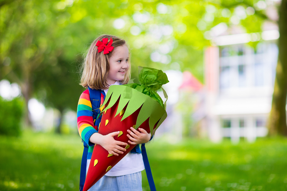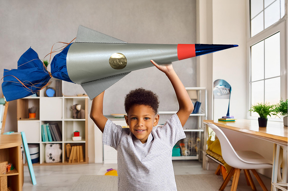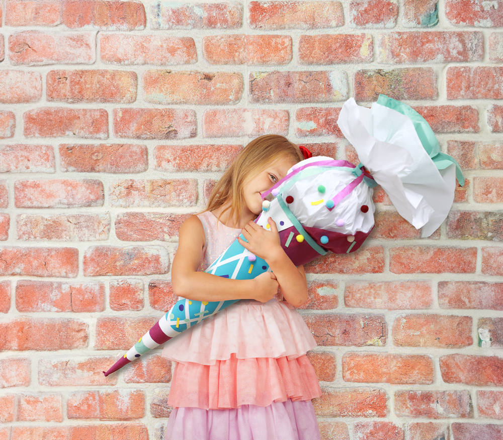 Für die Tütenspitze einen Viertelkreis im Radius von ca. 10 cm auf Tonpapier in einer anderen Farbe aufzeichnen, ausschneiden, außen zu einer Tüte zusammenkleben und auf die Spitze stecken bzw. festkleben. Weitere schmale Streifen Tonpapier in den Wunschfarben ankleben. Für das Waffelmuster kleben Sie mit Masking-Tape in weiß oder Pastellfarben Streifen im Rautenmuster auf. Mit kleinen, verschieden farbigen Pompons können Sie den Rohling nach Lust und Laune verzieren.
