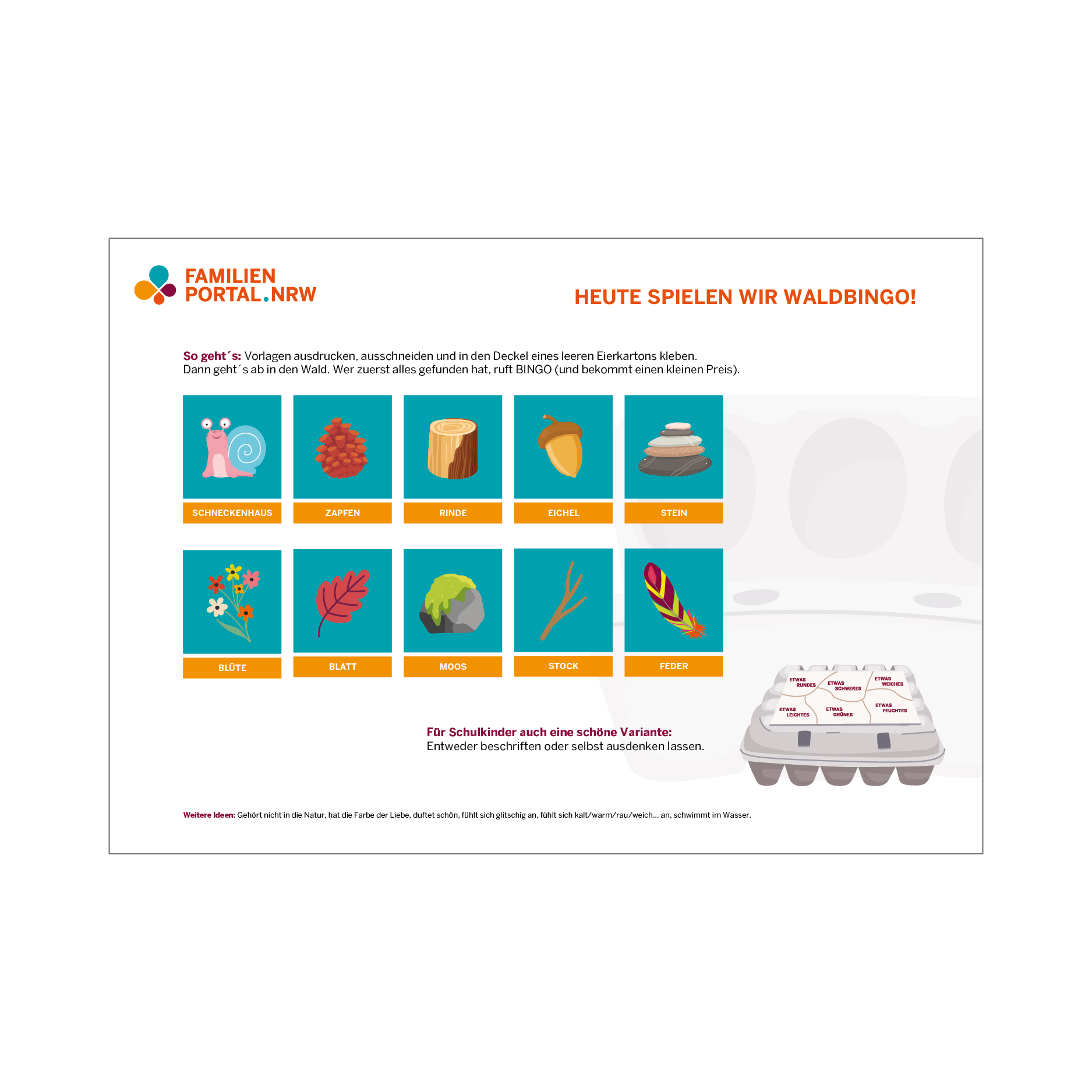Waldbingo ist ein vergnügliches Outdoor-Spiel, um Kinder mit der Natur vertraut zu machen und ihr Interesse an der Umwelt zu wecken. Es schärft die Beobachtungsgabe, fördert die Bewegung an der frischen Luft und erweitert das Wissen über die Tier- und Pflanzenwelt. Das Spiel kann in vielerlei Varianten gespielt werden, je nachdem, welche Art von Naturmaterialien in der Umgebung verfügbar sind. Hier finden Sie verschiedene Anregungen.