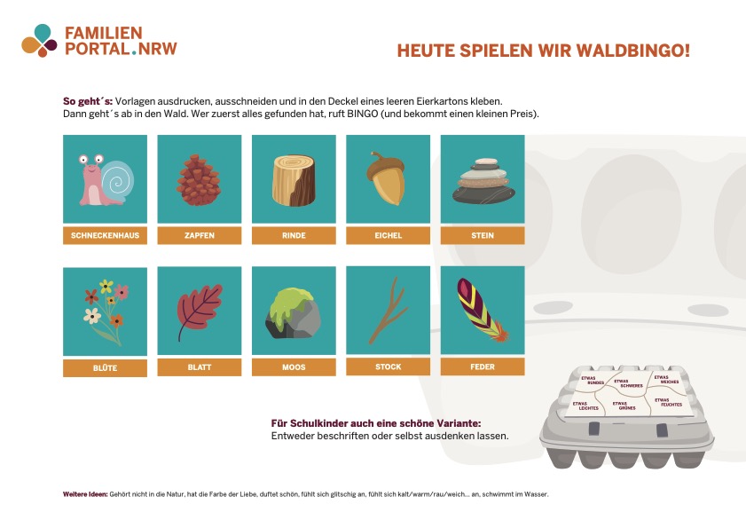 - Wer zuerst alles gefunden hat, ruft BINGO. Alternativ kann das Spiel auch beendet werden, wenn alle Kinder ihre Eierkartons vollständig gefüllt haben.