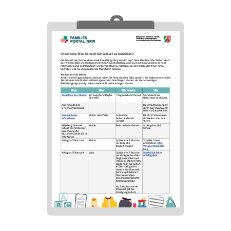 Rund um die Geburt gibt es einige Dinge zu bedenken und zu erledigen. Mit der folgenden Liste erhalten Sie einen Überblick über die wichtigsten Formalitäten, um die Sie sich vor und nach der Geburt kümmern müssen.