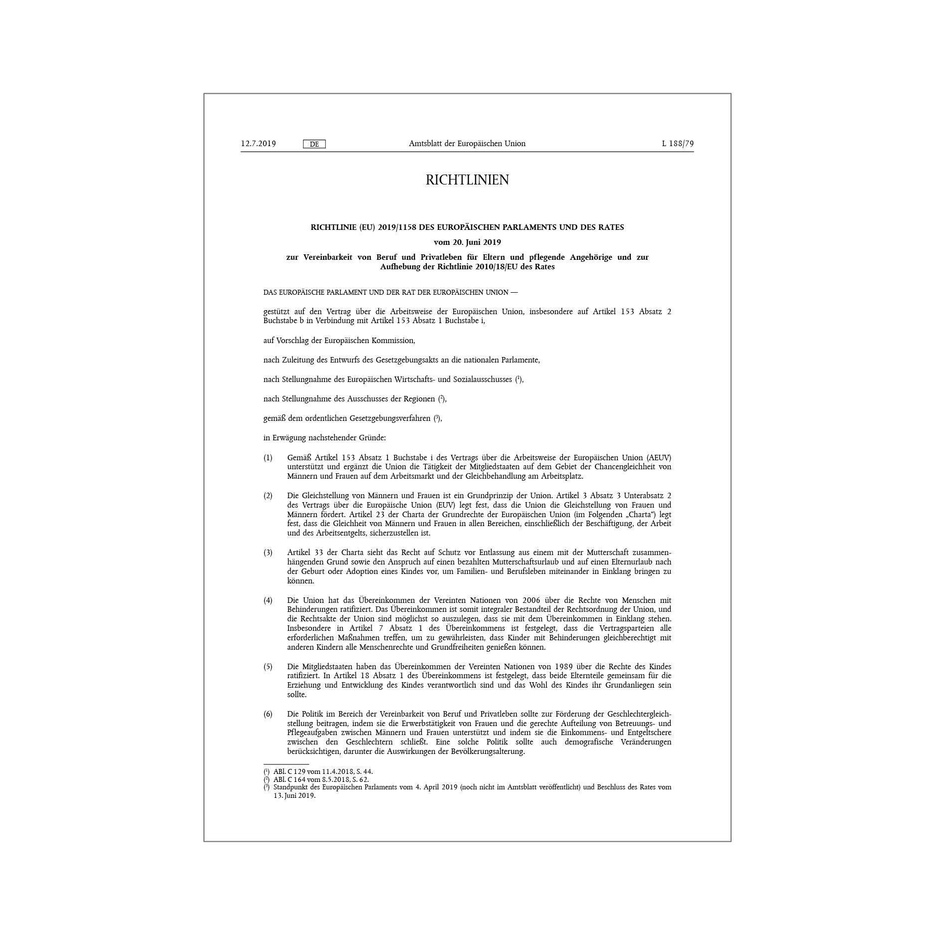 DIRECTIVE (EU) 2019/1158 OF THE EUROPEAN PARLIAMENT AND OF THE COUNCIL on "Work-life balance for parents and carers" was adopted on June 20, 2019. It sets minimum standards to achieve equality between men and women in terms of labor market opportunities and treatment in the workplace.