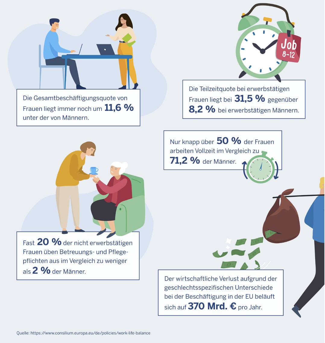 Equality between men and women is a fundamental principle of the European Union. However, reconciling work and private life is still a major challenge for many employees and parents with caring responsibilities. This has a negative impact on the employment rate of women: