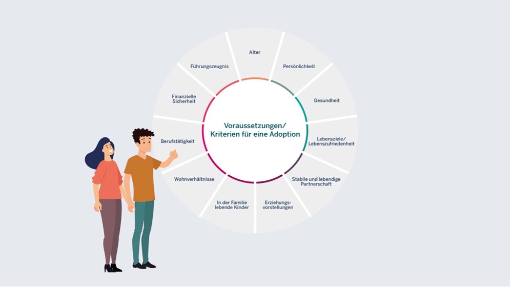 Il processo di adozione prevede diversi colloqui personali e almeno una visita a domicilio da parte dello specialista responsabile. I colloqui si concentrano su domande riguardanti l'infanzia e la famiglia della coppia, il rapporto di coppia, la gestione dell'assenza involontaria di figli e la motivazione dell'adozione. Vengono esaminati anche gli obiettivi futuri personali e condivisi, le idee genitoriali e le circostanze sociali ed economiche. I seguenti criteri fanno parte della valutazione dell'idoneità all'adozione: