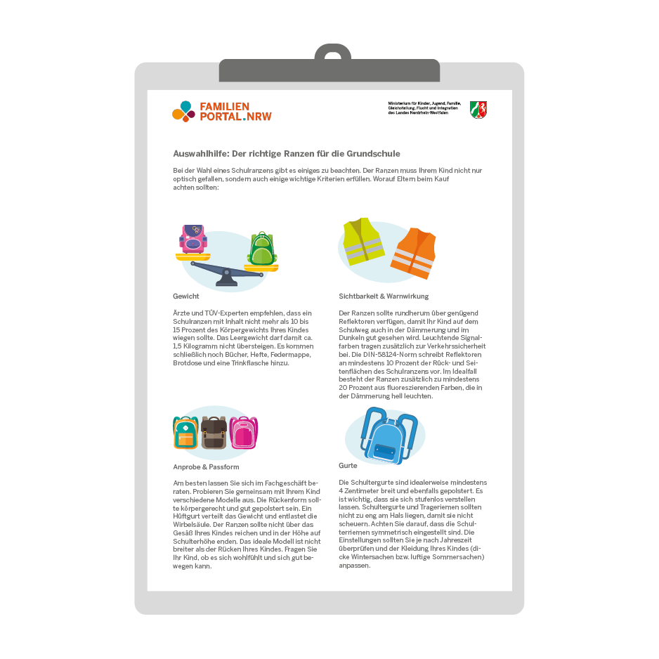 Medicii și experții TÜV recomandă ca ghiozdanul școlar, cu tot cu conținut, să nu cântărească mai mult de 10-15% din greutatea corporală a copilului dumneavoastră. Greutatea goală nu ar trebui să depășească 1,5 kilograme. La urma urmei, mai trebuie transportate cărți, caiete, truse de creioane, cutii de prânz și o sticlă de apă.